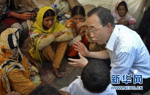 8月15日,聯合國秘書長潘基文(右一)在巴基斯坦旁遮普省與受災者交談。聯合國秘書長潘基文當日訪問巴基斯坦中部旁遮普省洪災地區。他形容這場洪災是他“所見最慘重的自然災害”,呼吁國際社會加快向巴基斯坦施援。新華社/路透