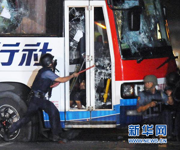 8月23日,在菲律賓馬尼拉,警察對被劫持旅游車展開行動。新華社/法新