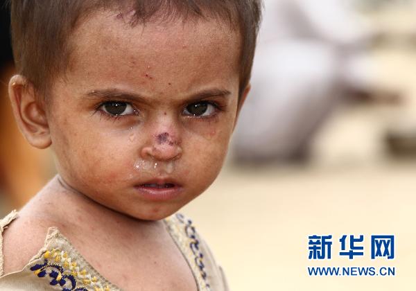 8月31日,在巴基斯坦南部的特達地區,一名兒童等待就醫。罕見的洪災給當地造成極大破壞,在缺醫少藥的農村地區,災民們特別是婦女兒童的生命安全時刻受到疾病的威脅。 新華社記者袁滿攝