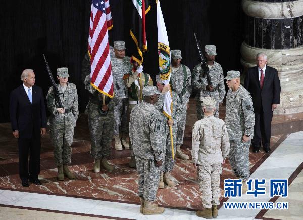9月1日,在伊拉克首都巴格達國際機場附近的駐伊美軍基地,駐伊拉克美軍前任最高司令奧迪爾諾(右二)和新任最高司令奧斯汀(前左一)在美副總統拜登(左一)和國防部長蓋茨(右一)注視下進行駐伊美軍軍旗交接儀式。 新華社記者 徐儼儼 攝