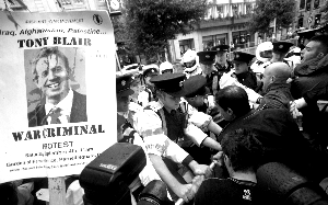 也有人“另辟蹊徑”,一名示威者說,她拿著書擠進書店等待布萊爾簽名。大概布萊爾正簽名的時候,她說,她要以“戰爭罪”名義將布萊爾逮捕,布萊爾顯得有點吃驚,不過安保人員也很快反應過來,隨即將她推開。