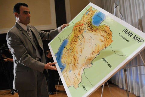 “人民圣戰(zhàn)者組織”發(fā)言人在新聞發(fā)布會(huì)現(xiàn)場展示核設(shè)施的衛(wèi)星圖片、標(biāo)明記號(hào)的地圖等。