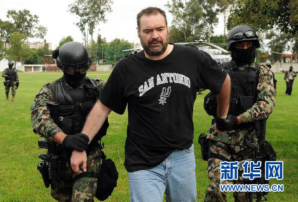 2010年9月13日,墨西哥一毒梟落網(wǎng)。 9月12日,在墨西哥普埃布拉市郊,墨西哥海軍陸戰(zhàn)隊士兵押送被捕的毒梟塞爾希奧·比利亞雷亞爾·巴拉甘。(新華社發(fā),鮑菲菲攝)