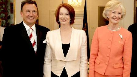 9月14日,吉拉德(中)宣誓就任澳總理后與男友馬西森(左一)以及澳總督布賴斯(右一)合影留念