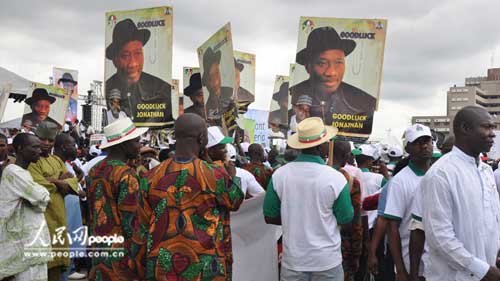 尼總統喬納森的支持者在阿布賈雄鷹廣場參加競選集會。殷淼攝