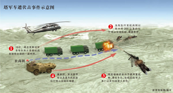 塔吉克斯坦官員20日表示,一批被雇傭的伊斯蘭極端武裝分子在該國境內與阿富汗交界地區伏擊了軍車,導致至少23名軍人身亡。