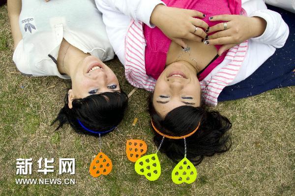 9月21日,在阿根廷首都布宜諾斯艾利斯,兩個女孩躺在草地上。 新華社發(馬丁·薩巴拉攝)