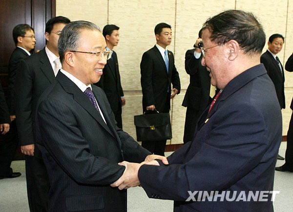 2009年9月16日,胡錦濤主席特使、國務委員戴秉國(前左)在朝鮮首都平壤同朝鮮第一副外相姜錫柱(前右)舉行會談前握手。(資料圖片)