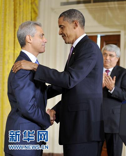 10月1日,在美國首都華盛頓白宮東廳,美國總統奧巴馬(中)與離任的白宮辦公廳主任拉姆·伊曼紐爾(左)握手,右為暫時接任的高級助理彼得·勞斯。奧巴馬當日宣布,白宮辦公廳主任拉姆·伊曼紐爾辭去現任職務,高級助理彼得·勞斯將暫時接任。新華社記者張軍攝