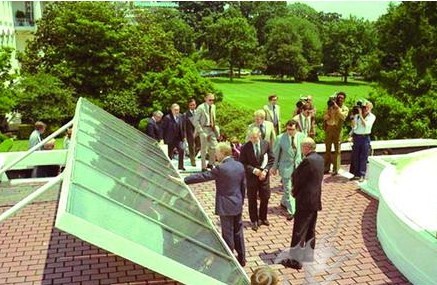 資料圖:卡特1979年曾在白宮屋頂舉行發(fā)布會(huì),展示上面安裝的32塊電池板,希望借此傳達(dá)美國(guó)要擺脫對(duì)進(jìn)口石油的依賴,但一直到現(xiàn)在美國(guó)人都沒有擺脫對(duì)進(jìn)口石油的依賴。1986年白宮屋頂翻修,這些電池板被移走。后來被安裝在一所學(xué)校里,用來給學(xué)生食堂燒水。