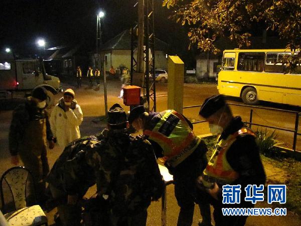 2010年10月9日,在匈牙利維斯普雷姆州奧伊考市附近的科隆達爾村,警察和軍人協助當地居民撤離。新華社發(尤哈斯·巴林特攝)