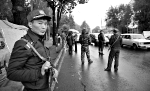 8日,比什凱克,警察在街頭執(zhí)勤。議會(huì)選舉是該國政體從總統(tǒng)制轉(zhuǎn)向議會(huì)制的關(guān)鍵步驟。新華社發(fā)