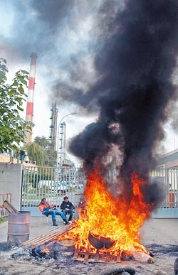 法國當局下令煉油廠工人復工,但工人在煉油廠要道燒輪胎。