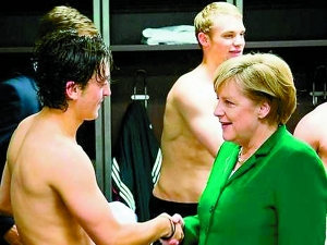 從照片中可以看出,更衣室里一片狼藉。不少球員赤裸上身,默克爾則穿著綠色外套,站在半裸的球員們面前與他們親切交談。德國中場厄齊爾事后說,那時大家雖然為贏球感到高興,但默克爾的到來確實令氣氛有點尷尬,衣衫不整的情況下與總理握手真令人感到不自在。