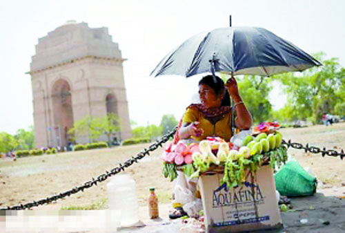 一名小販在印度首都新德里的印度門前兜售水果。