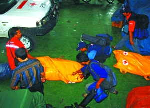 26日,救援人員整理運尸袋。由于受災島嶼偏遠,救援困難。