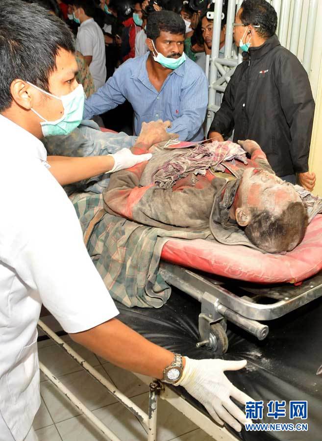 10月26日,印度尼西亞默拉皮火山附近的一名因火山噴發受傷的男子被運往醫院。位于印度尼西亞中爪哇省的默拉皮火山26日下午開始噴發火山灰,已致死十余人。新華社/法新