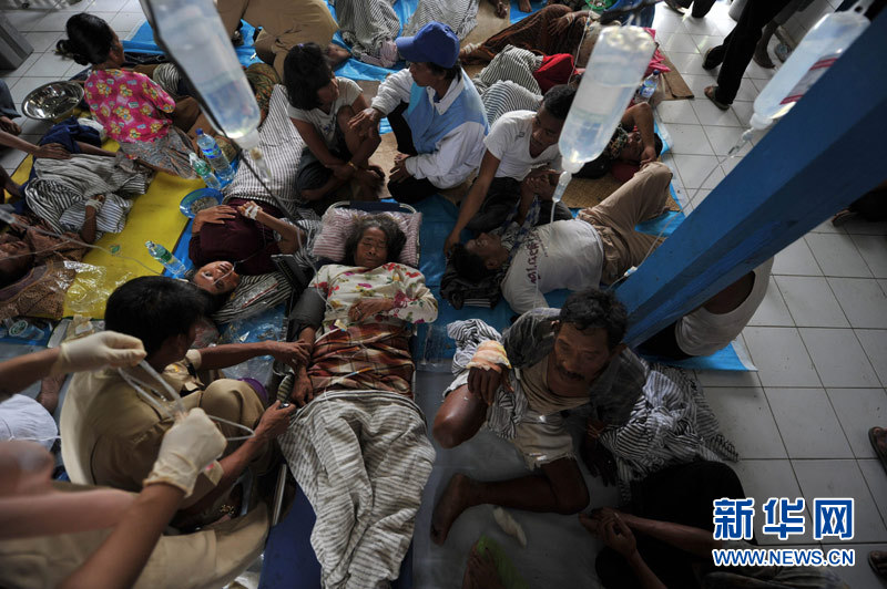 10月28日,在印度尼西亞西蘇門答臘省明打威群島的北巴蓋島一個(gè)小村莊,在海嘯中受傷的村民接受醫(yī)護(hù)人員治療。
