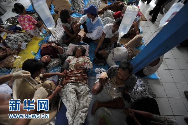 10月28日,在印度尼西亞西蘇門答臘省明打威群島的北巴蓋島一個小村莊,在海嘯中受傷的村民接受醫護人員治療。 新華社/法新