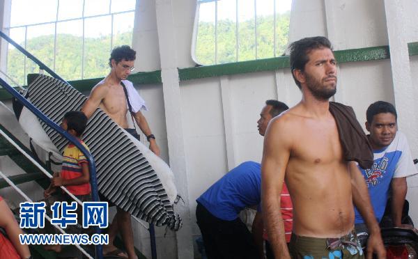 10月28日,在海嘯中幸免于難的兩名外國游客乘船抵達印度尼西亞西蘇門答臘省首府巴東市。 新華社/法新