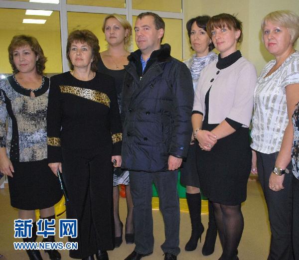 這張當地居民11月1日拍攝的照片顯示,俄羅斯總統梅德韋杰夫(中)在南千島群島(日本稱北方四島)的國后島上與當地的俄羅斯幼兒園教師合影。新華社/路透