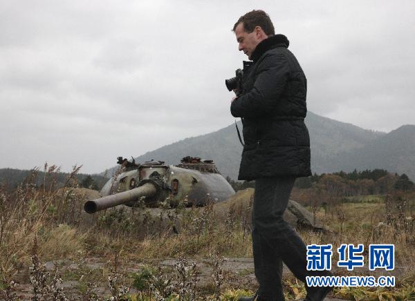 11月1日,俄羅斯總統(tǒng)梅德韋杰夫在南千島群島(日本稱北方四島)的國后島視察。 新華社/俄新社
