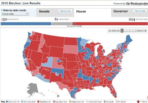 據報道,美國2010年中期選舉大部分州已經結束投票,最新出口民調結果顯示,共和黨在眾議院435議席中已獲過半席位,重新掌控眾議院。
