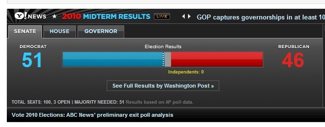 據報道,《華盛頓郵報》最新出口民調結果顯示,在美國2010年中期選舉當中,總統奧巴馬所在的民主黨在參議院已開出的97個席位中獲得了51個席位,超過參議院100個議席中的半數,獲得了參議院掌控權。