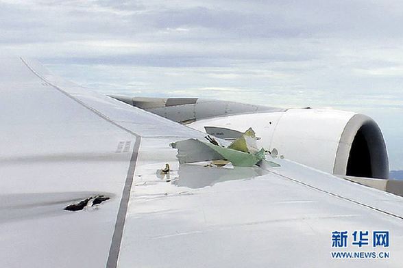 這是11月4日拍攝的澳大利亞航空公司的發生引擎故障的A380客機左側機翼。歐洲飛機制造商空中客車公司當天發表新聞公報,確認澳大利亞航空公司的這架空客A380客機4日在執行新加坡至悉尼航線飛行任務時,引擎發生故障,后緊急迫降。新華社/路透