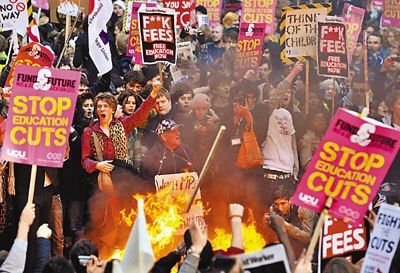 據香港《文匯報》12日報道,英國10日爆發首場反對財政緊縮措施的暴力示威,5萬名學生在首都倫敦上街抗議,反對政府削減教育開支,并大幅上調每年學費至9000英鎊(約合9.6萬元人民幣),是現水平的3倍。后來,示威演變成暴力沖突,部分人沖進保守黨總部大樓,破壞接待處和大堂,有人從天臺投擲雜物。事件中有14人受傷,32人被捕。首相卡梅倫譴責了此次事件,稱不能接受暴力行為。