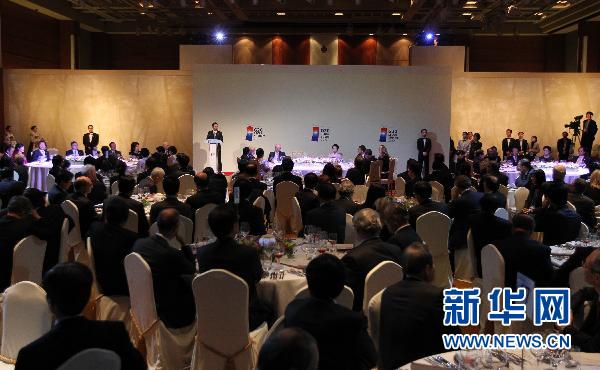 11月12日,在韓國首爾洲際酒店內,韓國總統李明博致祝酒辭。二十國集團首爾峰會當日下午結束為期兩天的日程,在通過《首爾宣言》后閉幕。韓國總統李明博和各國領導人在韓國首爾洲際酒店內舉行特別晚宴,慶祝峰會圓滿結束。新華社/韓聯社