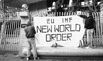 11月27日,愛爾蘭都柏林,民眾正在抗議政府的緊縮預(yù)算方案。圖中標(biāo)語意為“歐盟、國際貨幣基金組織——新的世界秩序”,諷刺政府將不得不在政策制定上聽命于歐盟和國際貨幣基金組織。