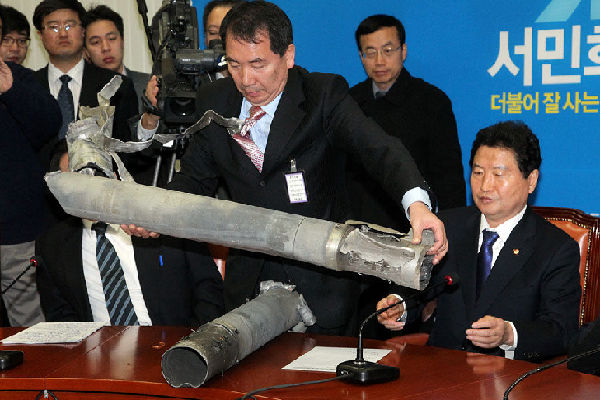 資料圖片:當地時間11月25日,韓國國大黨公布兩枚朝鮮炮彈的殘骸,譴責朝鮮炮擊延坪島的行為。韓國總統李明博在當日舉行的緊急安保會議上表示,在西部海域五島等最容易遭受攻擊的地方,要“配置世界最強的軍事裝備進行徹底的準備”,以應對朝鮮的非對稱戰力。