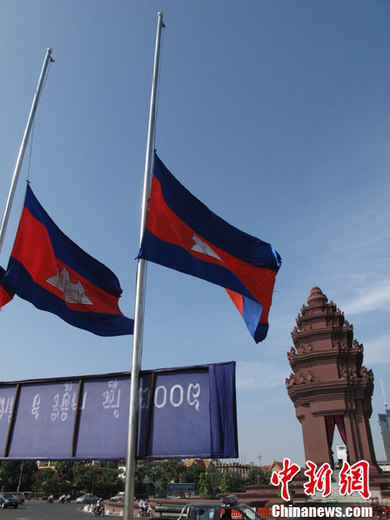 11月25日是柬埔寨“11.22”金邊鉆石橋踩踏事件全國哀悼日。柬埔寨全國政府部門、寺廟、學校和不少企業都下半旗志哀。圖為位于金邊市中心的獨立紀念碑一帶,柬埔寨國旗降至一半,為事件罹難者志哀。