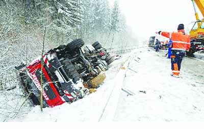 上圖為德國一段公路上因大雪發生了交通事故,出事車輛側翻在路邊。