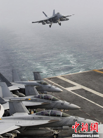 參加美韓軍演的美軍艦載機準備在航母著艦