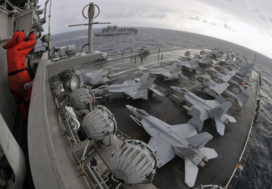 12月2日,美國(guó)海軍喬治-華盛頓號(hào)航母戰(zhàn)斗群在朝鮮半島西部海域進(jìn)行物資補(bǔ)給作業(yè),為即將到來(lái)的美日聯(lián)合軍演做準(zhǔn)備。喬治-華盛頓號(hào)航母剛剛結(jié)束與韓國(guó)海軍進(jìn)行的為期三天的黃海聯(lián)合軍演。