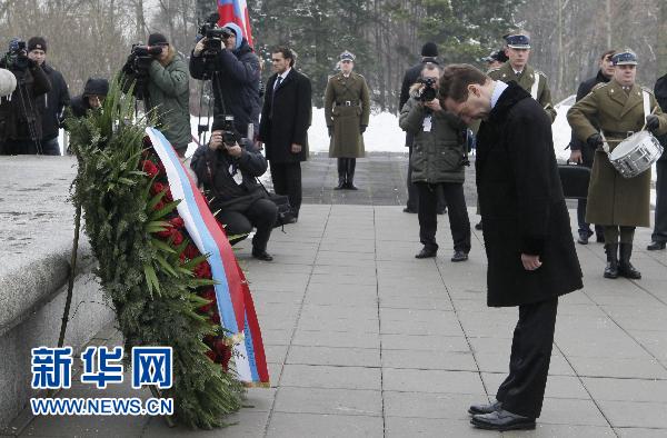 12月7日,俄羅斯總統(tǒng)梅德韋杰夫在波蘭首都華沙向蘇軍戰(zhàn)士墓紀(jì)念碑敬獻(xiàn)花圈。新華社/美聯(lián)社