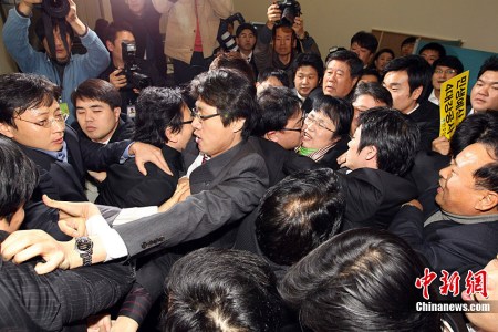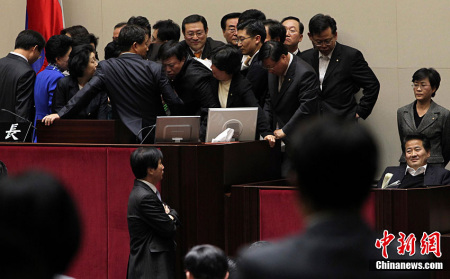 在韓國(guó)議會(huì),這類激烈沖突已經(jīng)屢見(jiàn)不鮮。遇到自己強(qiáng)烈反對(duì)的議案或者提議時(shí),議員們通常會(huì)用“武力”表達(dá)自己的不滿。嚴(yán)重時(shí),議員利用桌椅、滅火器群毆,甚至有人被打掉牙。