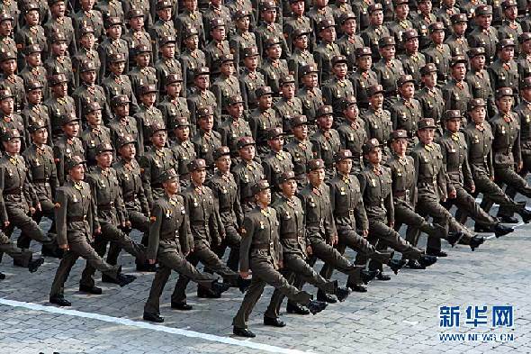10月10日,在朝鮮首都平壤,受閱部隊接受檢閱。朝鮮10日上午在平壤金日成廣場舉行盛大閱兵式,慶祝朝鮮勞動黨成立65周年。 新華社記者姚大偉攝