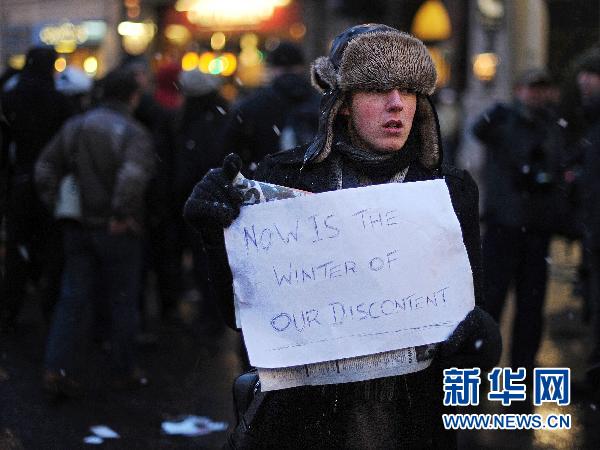從上午開始,數千名學生就已經出現在威斯敏斯特宮外,他們集體舉著“停止削減開支”、“對漲學費說不”的標語,一些激進的學生則呼吁舉行“總罷工”,抗議政府將大學學費上限從每年3200英鎊提高到9000英鎊。