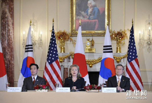 12月6日,在美國首都華盛頓國務院,美國國務卿希拉里·克林頓(中)、韓國外交通商部長官金星煥(右)和日本外務大臣前原誠司舉行會晤。美日韓三國外長當日在華盛頓會晤,討論朝鮮半島最新局勢及其對地區安全的影響。新華社記者張軍攝