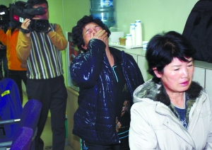 13日,韓國釜山的一艘沉沒漁船的船員家屬獲知消息后難抑悲傷。