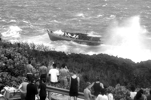 撞崖 偷渡船被巨大的海浪拋向崖壁。