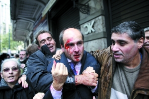 當(dāng)?shù)貢r(shí)間15日,雅典,希臘前發(fā)展部長(zhǎng)被抗議者打傷。