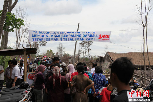 今年10月下旬,位于印尼日惹市的默拉皮火山在沉睡百年后,再次大規模數次噴發,并造成300多人罹難、成千上萬人受傷,數十萬人撤離家園。默拉皮火山11月份停止噴發后,來自印尼各地的民眾紛紛來此旅游觀光。火山腳下一個叫GUNGAND被火山巖漿埋沒的村莊,每天來旅游的人數逾5000人。圖為當地民眾周日紛紛前往該村察看災后情景。中新社發 顧時宏 攝