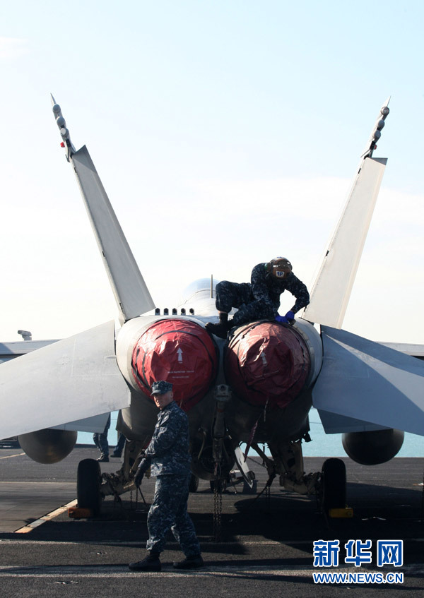 1月11日,在韓國釜山,士兵在“卡爾·文森”號航母上工作。當日,美國海軍核動力航空母艦“卡爾·文森”號抵達韓國海軍作戰司令部釜山基地。 新華社發(樸真熙 攝)