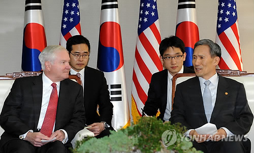 蓋茨(左)和金寬鎮14日在首爾國防部舉行韓美防長會談(韓聯社)