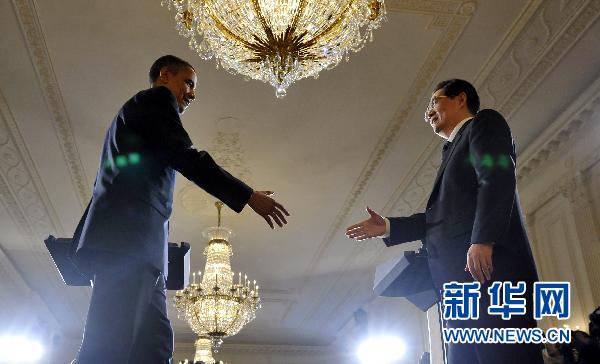 1月19日,中國國家主席胡錦濤同美國總統奧巴馬在白宮共同會見記者。 新華社記者 張軍 攝