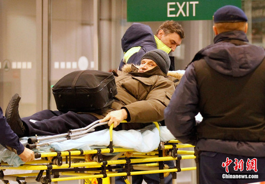當地時間2011年1月24日16時32分(北京時間1月24日21時32分),俄羅斯莫斯科多莫杰多沃機場抵達大廳內發生自殺式炸彈爆炸。造成35人死亡,180人受傷。圖為傷者被送往醫院救治。
